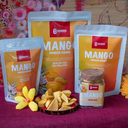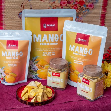 Xoài cũng rất linh hoạt và có thể ăn tươi, sấy khô, đông lạnh hoặc nấu chín. Tại Bamboo Freeze Drying, chúng tôi cung cấp nhiều loại sản phẩm xoài như xoài sấy ớt, xoài sấy lát, xoài sấy đông khô và dạng bột. Tất cả các sản phẩm của chúng tôi đều được làm từ trái cây nhiệt đới tự nhiên tại Việt Nam với công nghệ sấy tiên tiến. Chúng là những món ăn nhẹ lành mạnh thuần chay, ít đường hoặc không đường. Nếu bạn yêu thích xoài và muốn thưởng thức chúng quanh năm, hãy đặt mua sản phẩm yêu thích của bạn ngay hôm nay với những lựa chọn dưới đây.